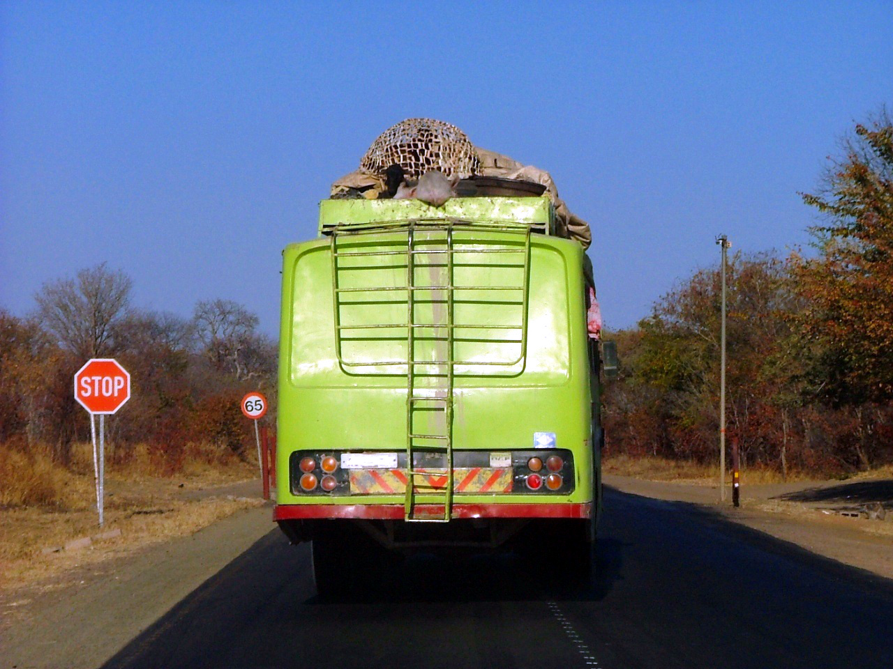 Luckily a few kilometers ahead there is a security check for vehicles entering the Mosi-oa-Tunya National park, so I could get a couple of clearer shots and establish exactly what it was on top of that bus.